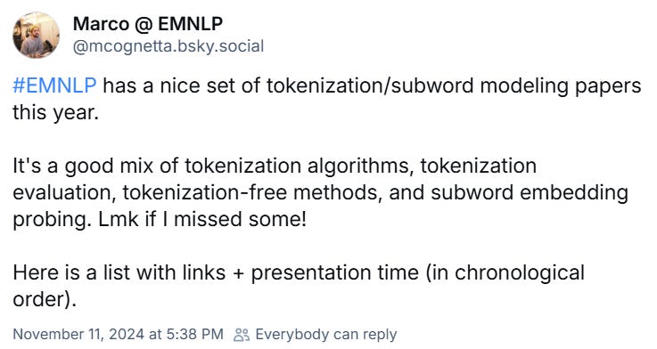 Tokenization is not really the most popular topic in NLP, but there were quite a few interesting papers on tokenization. Marco Cognetta put together a great thread with all of them on BlueSky: