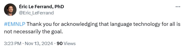Last on the topic of multilinguality, I really liked the paper, “The Zeno’s Paradox of ‘Low-Resource’ Languages.” This paper contends with what it means for a language to be classified as low-resource, and how our framing of languages as high- or low-resource is damaging, as it changes the way researchers and language community members think about a language. I also really liked the point about how framing low-resource languages as having to catch up to high-resource languages, and especially English, will mean that we always understand progress for research and tools for low-resource languages as being less developed than for high-resource languages. I hope to use some of the points in this paper to change the language I use when talking about low-resource languages, primarily to be more precise by what I mean by that term.
