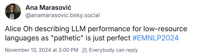 On Wednesday, multilingual NLP – at least how bad the current state of it is – was highlighted in the panel “The Importance of NLP in the LLM Era”. First, Alice Oh acknowledged how bad language model performance is for low resource languages: